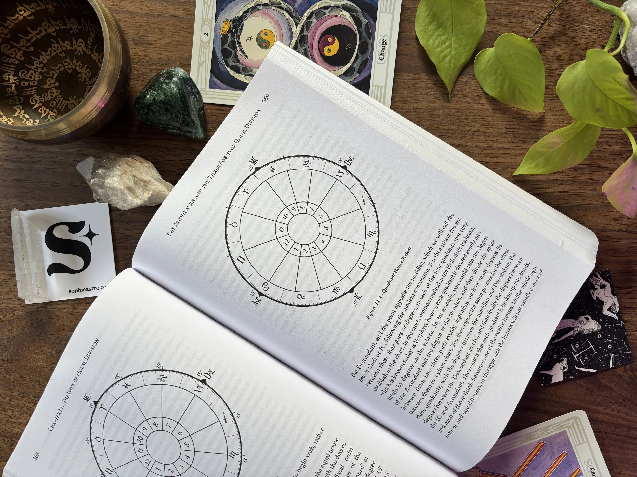 Open book with astrological charts on a wooden table, surrounded by crystals, tarot cards, a candle with symbols, and a plant.